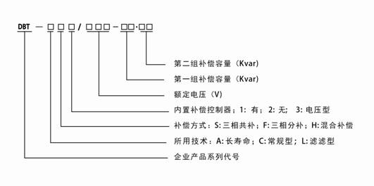如:DBT-CS1/450-20.10,表示常規(guī)型,內(nèi)置補(bǔ)償控制器,三相共補(bǔ),第一組電容為20kvar; 第二組無(wú)功輸出均為10kvar,總?cè)萘繛?0kvar的智能型電容器。