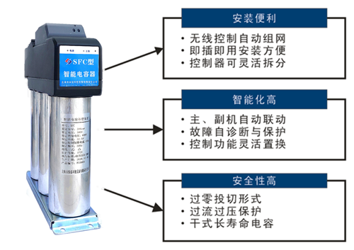 SFC型智能電容器則把無功補償控制器、投切開關、電容器、斷路器等集成為一體,采用無線控制,不需要控制接線;自動識別電容器,不需要人工設置參數;自動組網,即插既用,提高工作效率,減少材料損耗、降低生產成本,完全替代傳統無功補償系統。參數后系統才能正常投運。